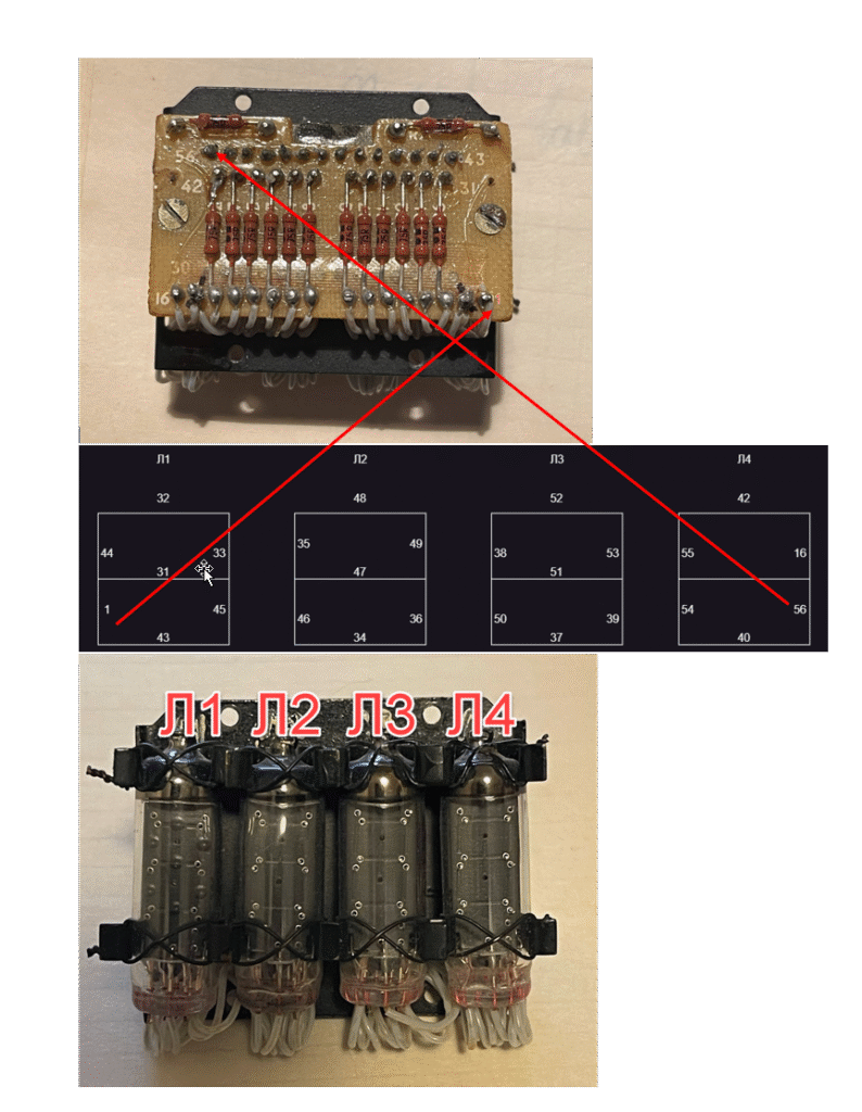 Наконец-то добрался до того, чтобы сделать reverse engineering на контакты нумитронов. Составил небольшую схему для удобства.